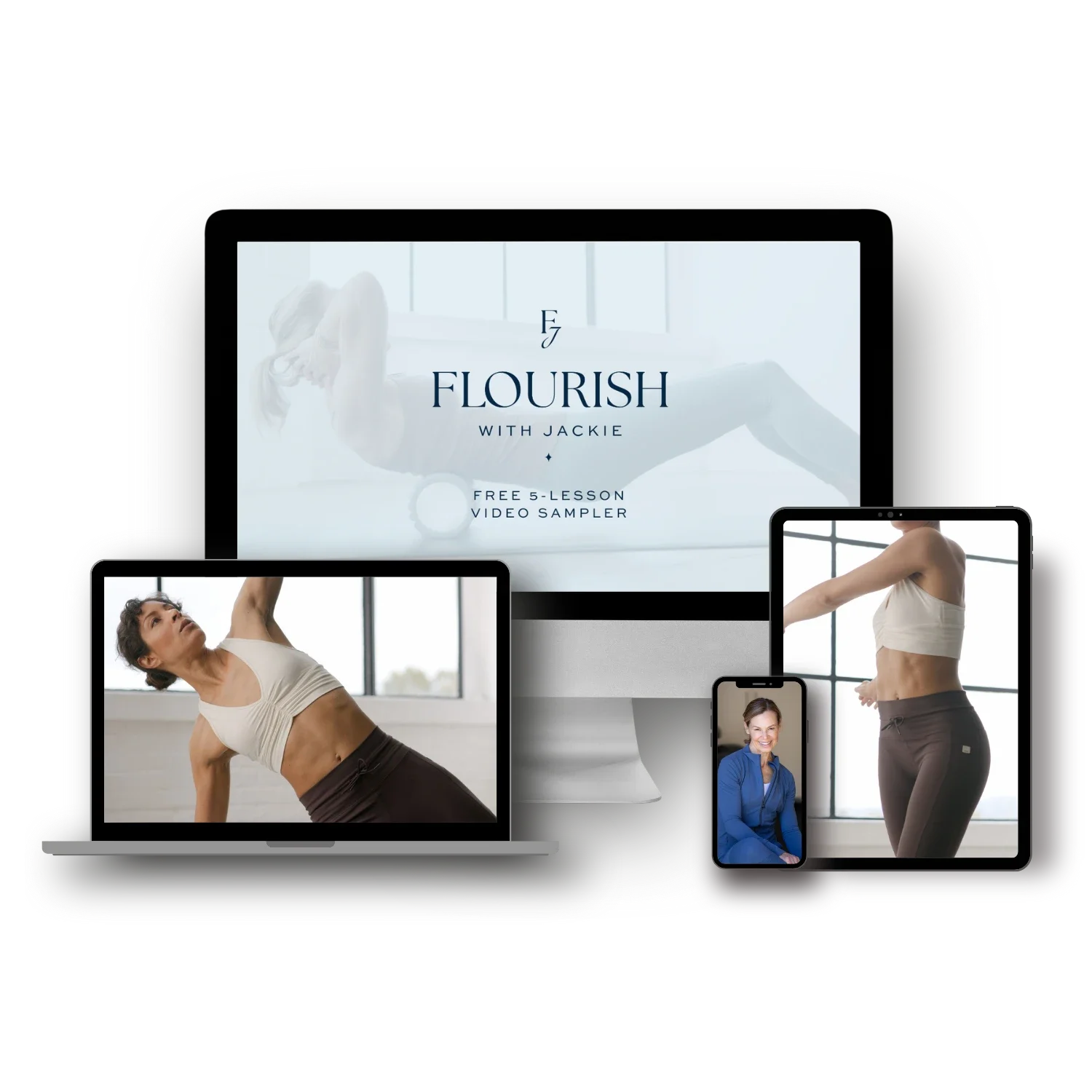 Dark blue circular logo with white text that reads "FLOURISH WITH JACKIE I LONGEVITY STARTS HERE" and a stylized letter FJ in the center.