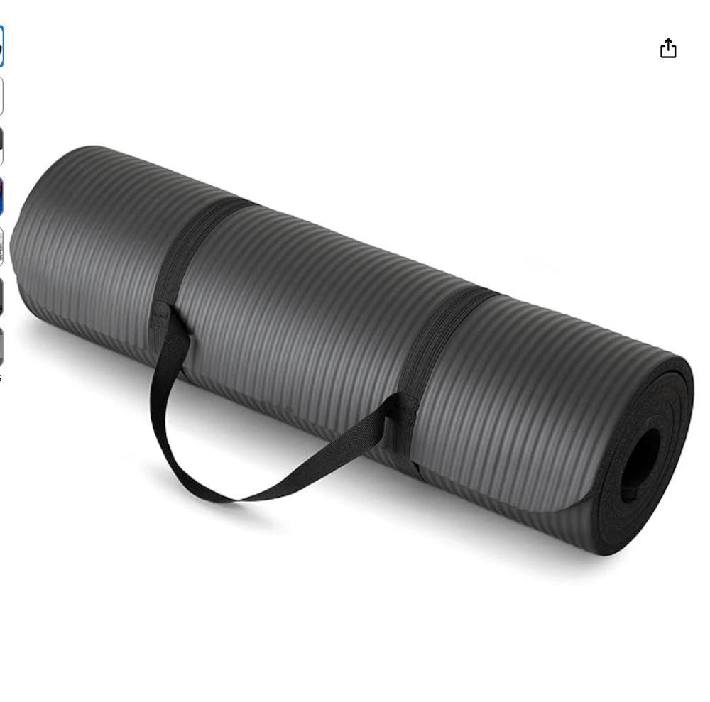 Extra-thick, cushioned mat for yoga, gym, and everyday exercise. Features a textured, non-slip surface, supportive foam construction, and elastic strap for storage and over-the-shoulder carrying.